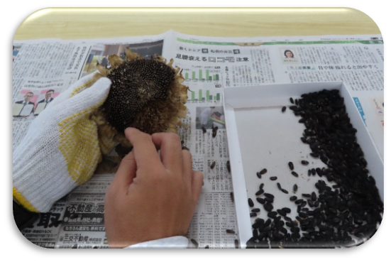 ひまわりの種とりは、はじめての人も多く、乾燥をさせて花から種をとり出しました。
