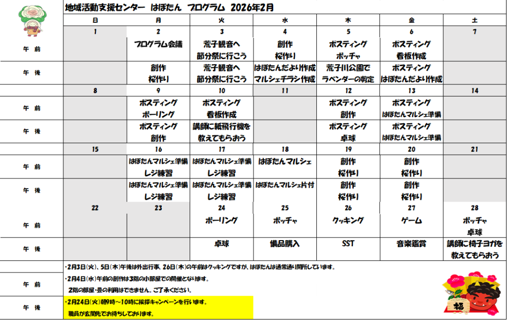 毎月のプログラム・行事内容、翌月の行事予定を発信していきます。