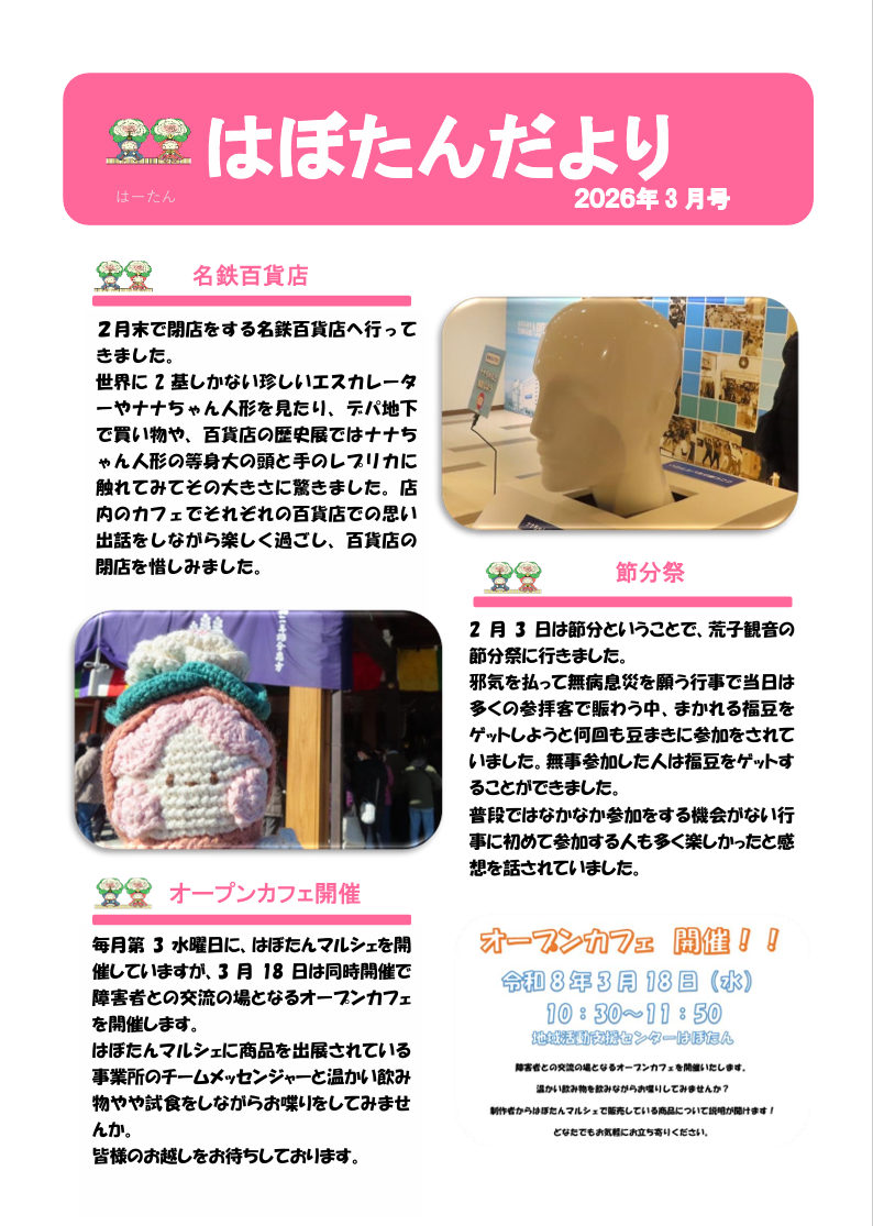 中川区自立支援連絡協議会 はぼたんだより2024年3月号 公開日:2024年3月1日 自立支援協議会 〇オープンカフェ開催します3月13日(水)のはぼたんマルシェではオープンカフェも併せて開催します。今回ははぼたんマルシェの商品の試食もできます!チームメッセンジャーと温かい飲み物を飲みながら話をしてみませんか?ぜひ足を運 […] 続きを読む