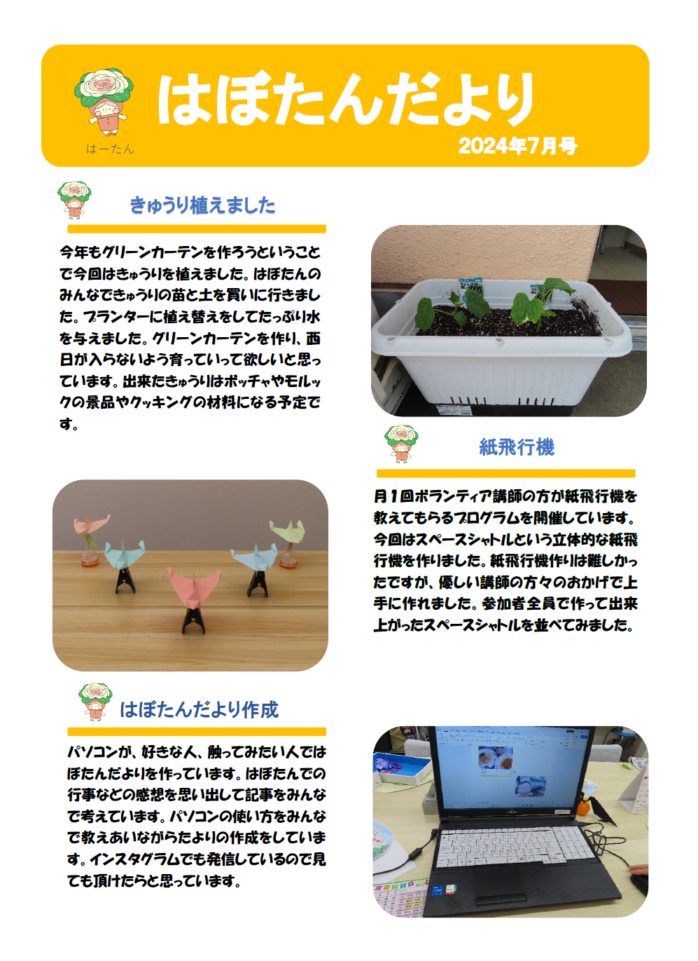 はぼたんだより 2024年7月号 更新日:2024年7月11日 公開日:2024年7月6日 地域活動支援センター「はぼたん」 きゅうりを植えました 今年もグリーンカーテンを作ろうということで今回はきゅうりを植えました。はぼたんのみんなできゅうりの苗と土を買いに行きました。プランターに植え替えをしてたっぷり水を与えました。グリーンカーテンを […] 続きを読む