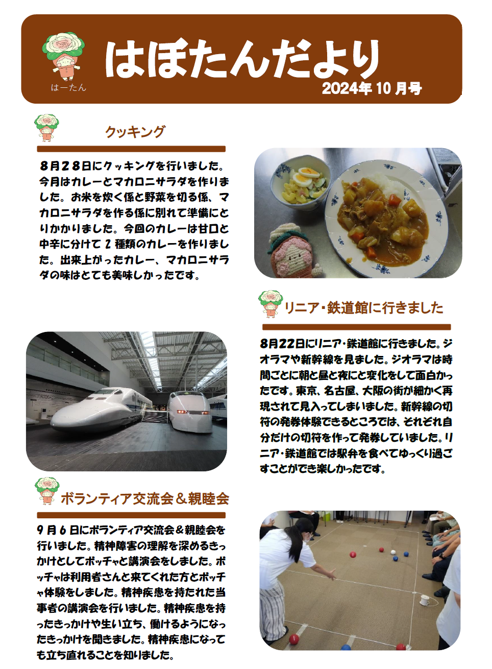 はぼたんだより 2025年度11月号 更新日:2025年11月28日 公開日:2025年10月29日 地域活動支援センター「はぼたん」 ボッチャ交流会10月9日、露橋スポーツセンターにてボッチャ交流会が開催をされました。はぼたんからも『チームはぼたん』として参加しました。参加チーム16チーム中3位という好成績をおさめることができました。参加された皆さんは […] 続きを読む