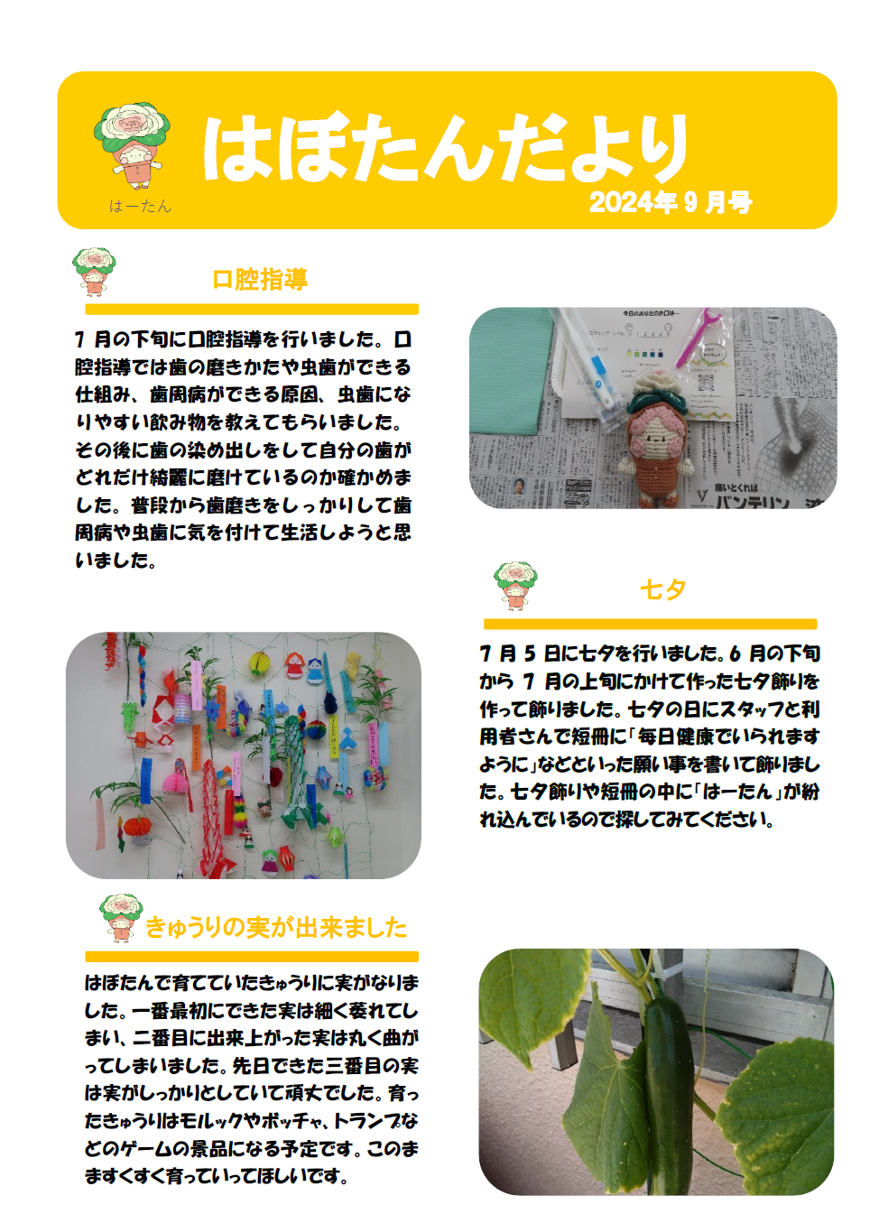 はぼたんだより 2024年9月号 公開日:2024年9月2日 地域活動支援センター「はぼたん」 口腔指導 7月の下旬に口腔指導を行いました。口腔指導では歯の磨きかたや虫歯ができる仕組み、歯周病ができる原因、虫歯になりやすい飲み物を教えてもらいました。その後に歯の染め出しをして自分の歯がどれだけ綺麗に磨けてるのか確か […] 続きを読む