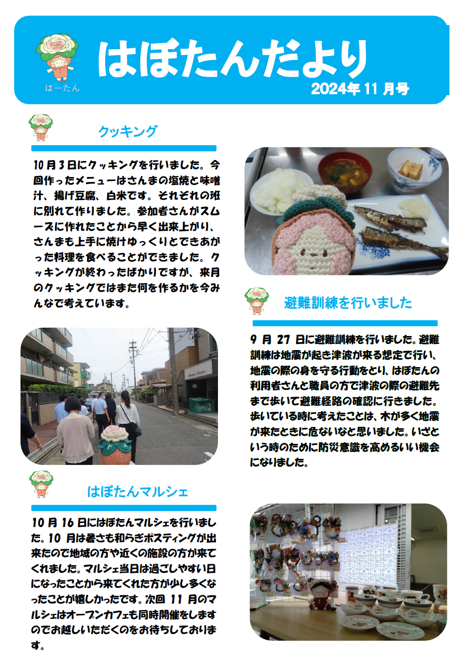 はぼたんだより 2024年度11月号 公開日:2024年10月31日 地域活動支援センター「はぼたん」 クッキング 10月3日にクッキングを行いました。今回作ったメニューはさんまの塩焼と味噌汁、揚げ豆腐、白米です。それぞれの班に別れて作りました。参加者さんがスムーズに作れたことから早く出来上がり、さんまも上手に焼けゆ […] 続きを読む