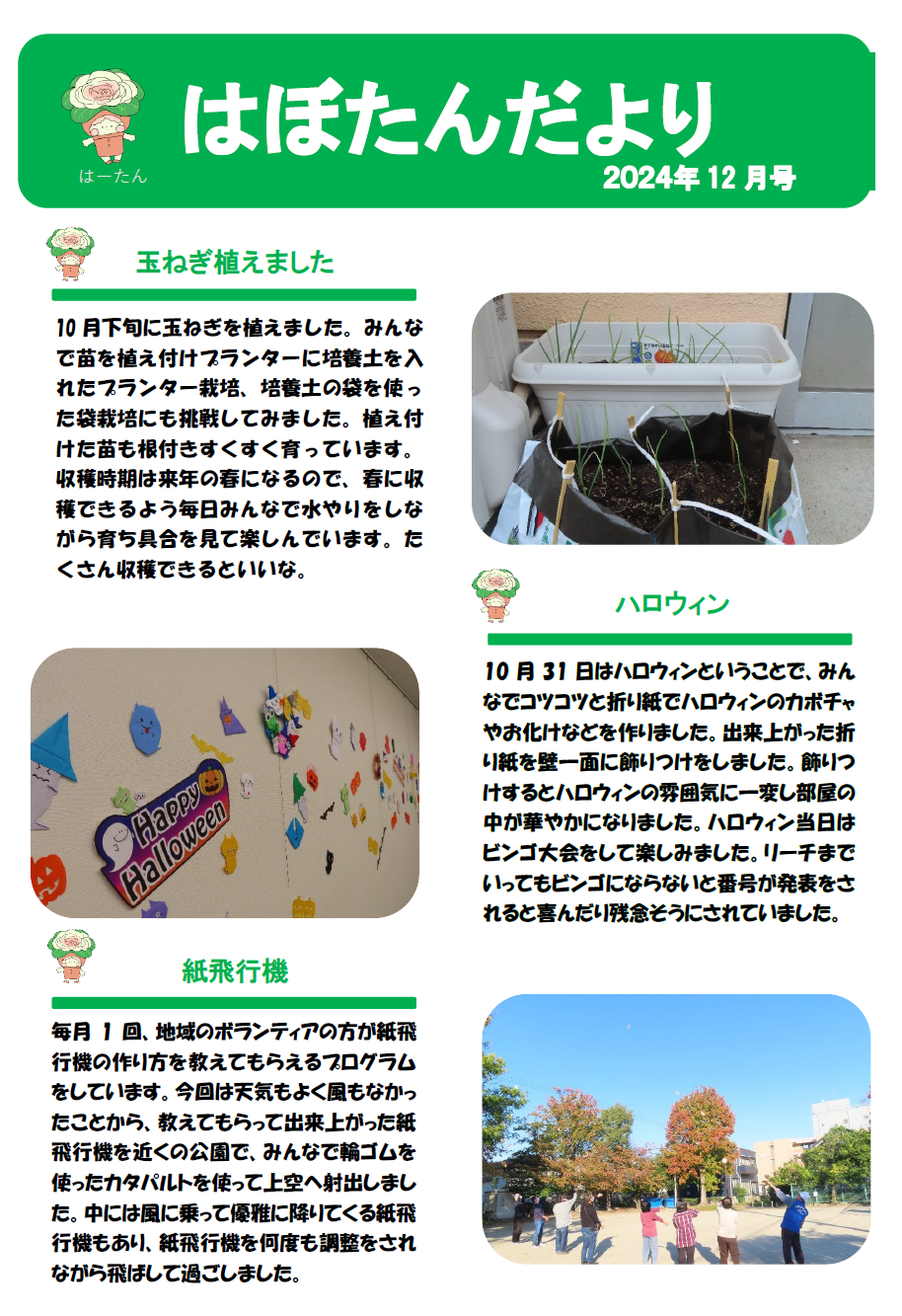 はぼたんだより 2024年度12月号 公開日:2024年11月28日 地域活動支援センター「はぼたん」 玉ねぎを植えました 10月下旬に玉ねぎを植えました。みんなで苗を植え付けプランターに培養土を入れたプランター栽培、培養土の袋を使った袋栽培にも挑戦してみました。植え付けた苗も根付きすくすく育っています。収穫時期は来年 […] 続きを読む