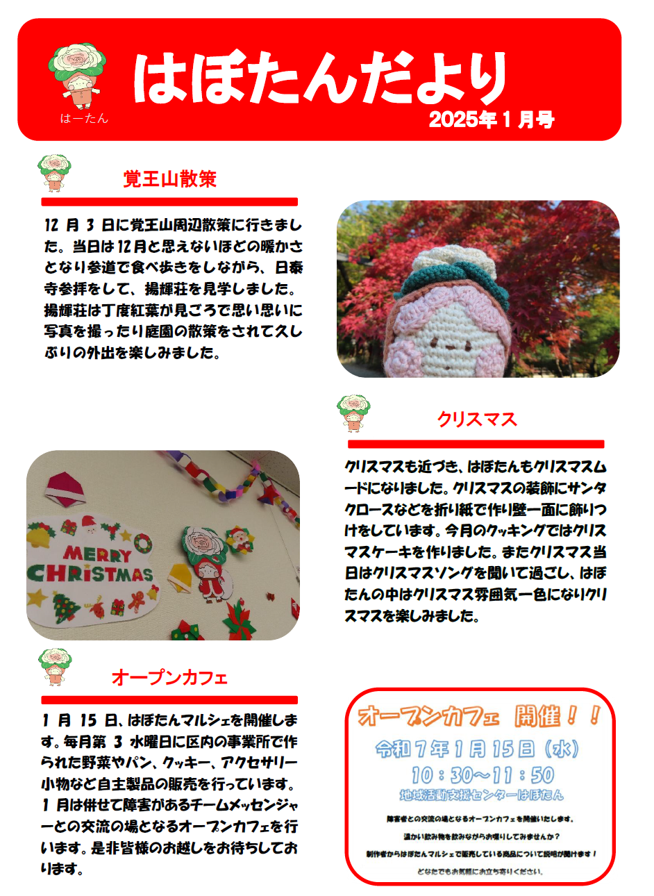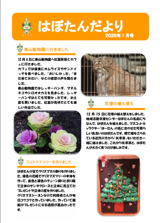 はぼたんだより 2025年度1月号 公開日:2025年12月27日 地域活動支援センター「はぼたん」 東山動物園に行きました 12月4日に東山動物園へ紅葉散策とカフェに行きました。カフェでは昼食にオムライスやサンドイッチを食べました。「おいしかった」「また来てみたい」などの感想の声を聞きました。東山動物園ではレッサーパン […] 続きを読む