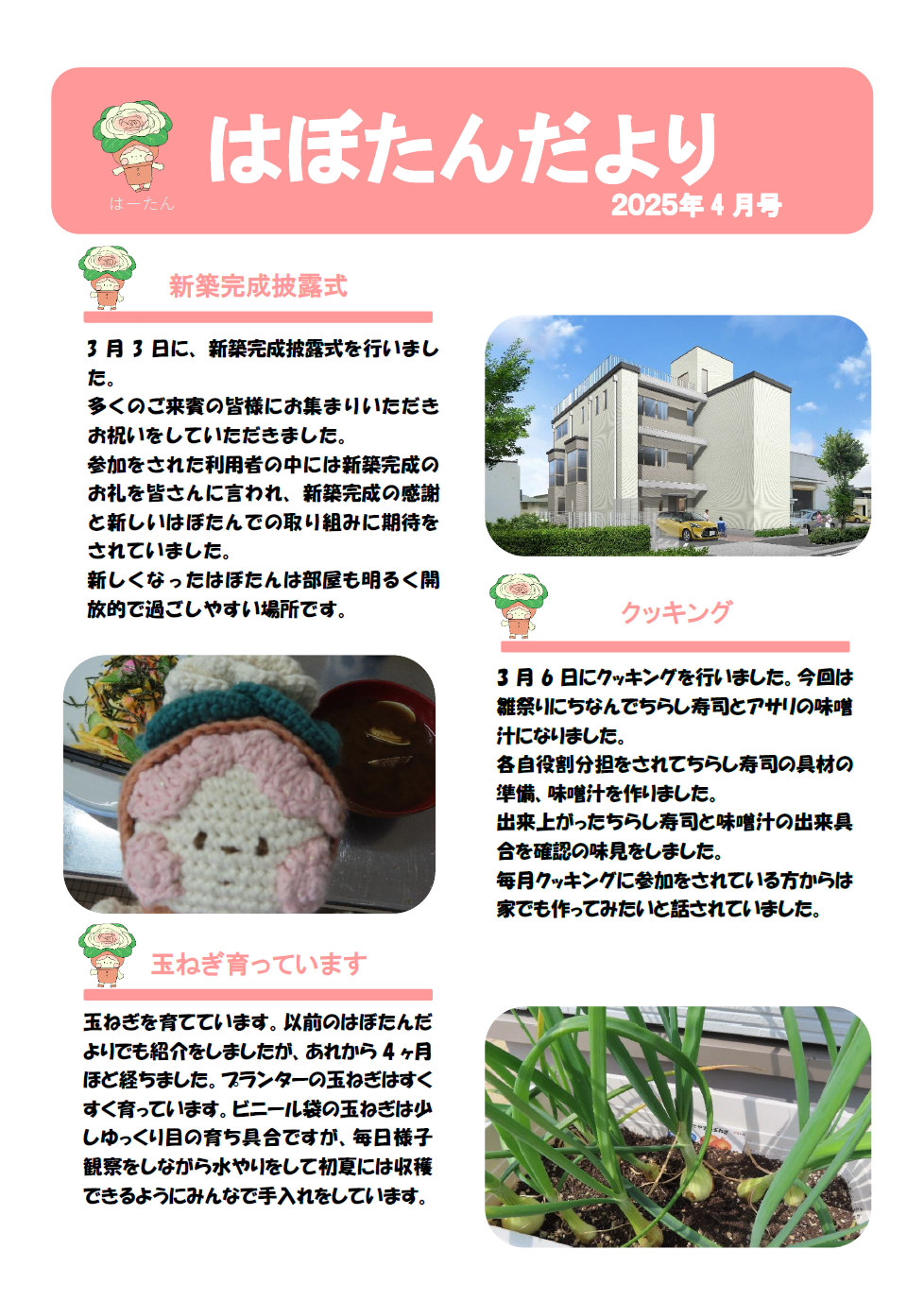 はぼたんだより 2025年度4月号 公開日:2025年3月28日 地域活動支援センター「はぼたん」 新築完成披露式 3月3日に、新築完成披露式を行いました。多くのご来賓の皆様にお集まりいただきお祝いをしていただきました。参加をされた利用者の中には新築完成のお礼を皆さんに言われ、新築完成の感謝と新しいはぼたんでの取り組み […] 続きを読む