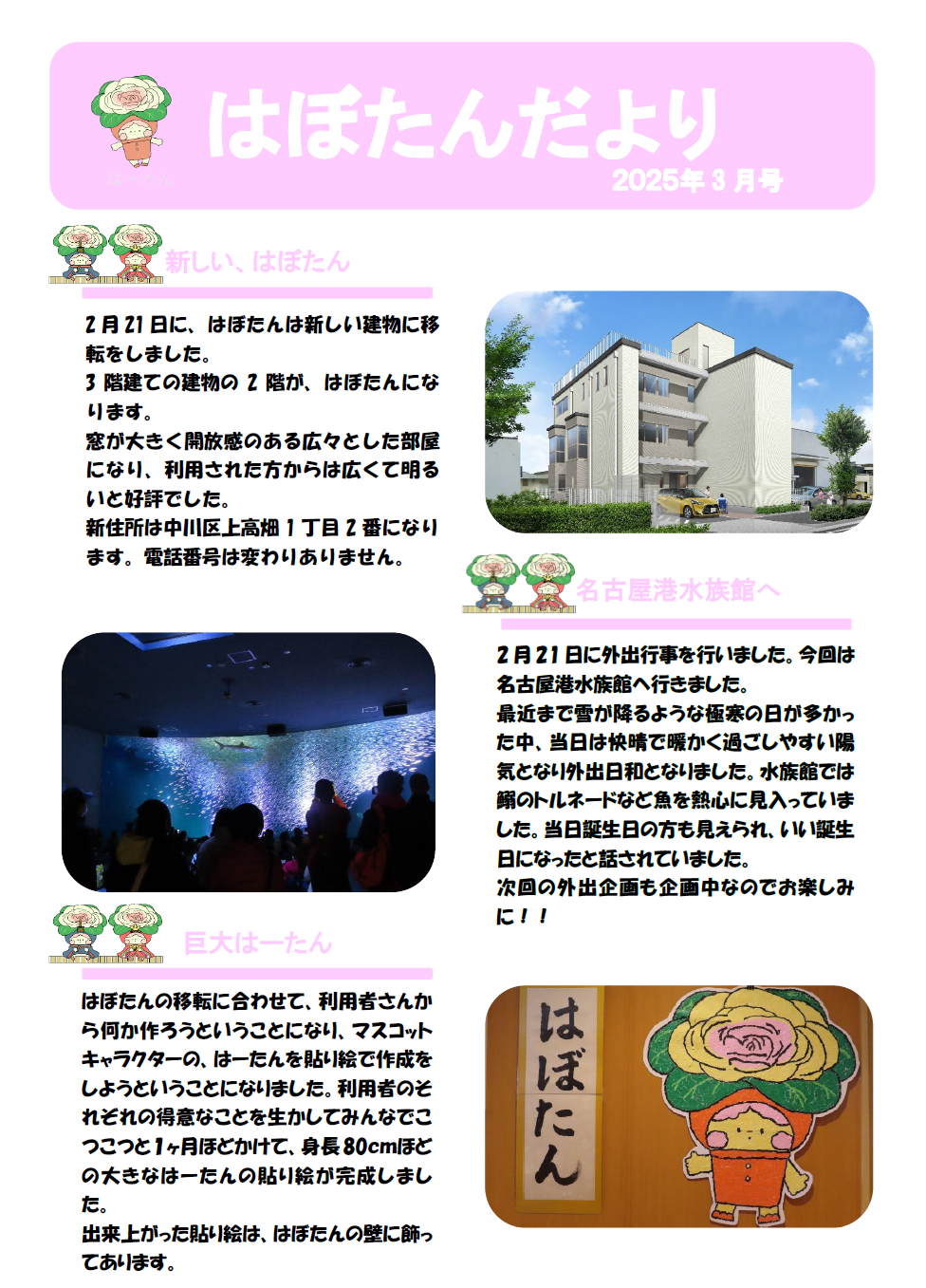 はぼたんだより 2024年度3月号 公開日:2025年3月4日 地域活動支援センター「はぼたん」 新しい、はぼたん 2月21日に、はぼたんは新しい建物に移転をしました。3階建ての建物の2階が、はぼたんになります。窓が大きく開放感のある広々とした部屋になり、利用された方からは広くて明るいと好評でした。新住所は中川区上高 […] 続きを読む