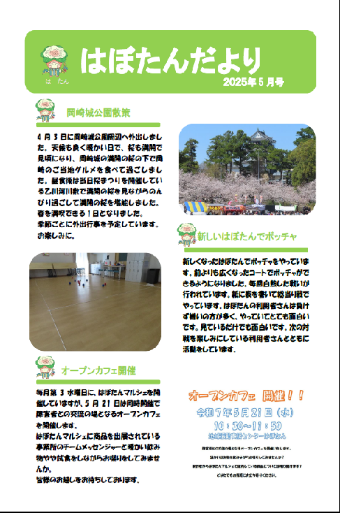 はぼたんだより 2025年度5月号 公開日:2025年5月2日 地域活動支援センター「はぼたん」 岡崎城公園散策 4月3日に岡崎城公園周辺へ外出しました。天候も良く暖かい日で、桜も満開で見頃になり、岡崎城の満開の桜の下で岡崎のご当地グルメを食べて過ごしました。昼食後は当日桜まつりを開催している乙川河川敷で満開の桜を […] 続きを読む