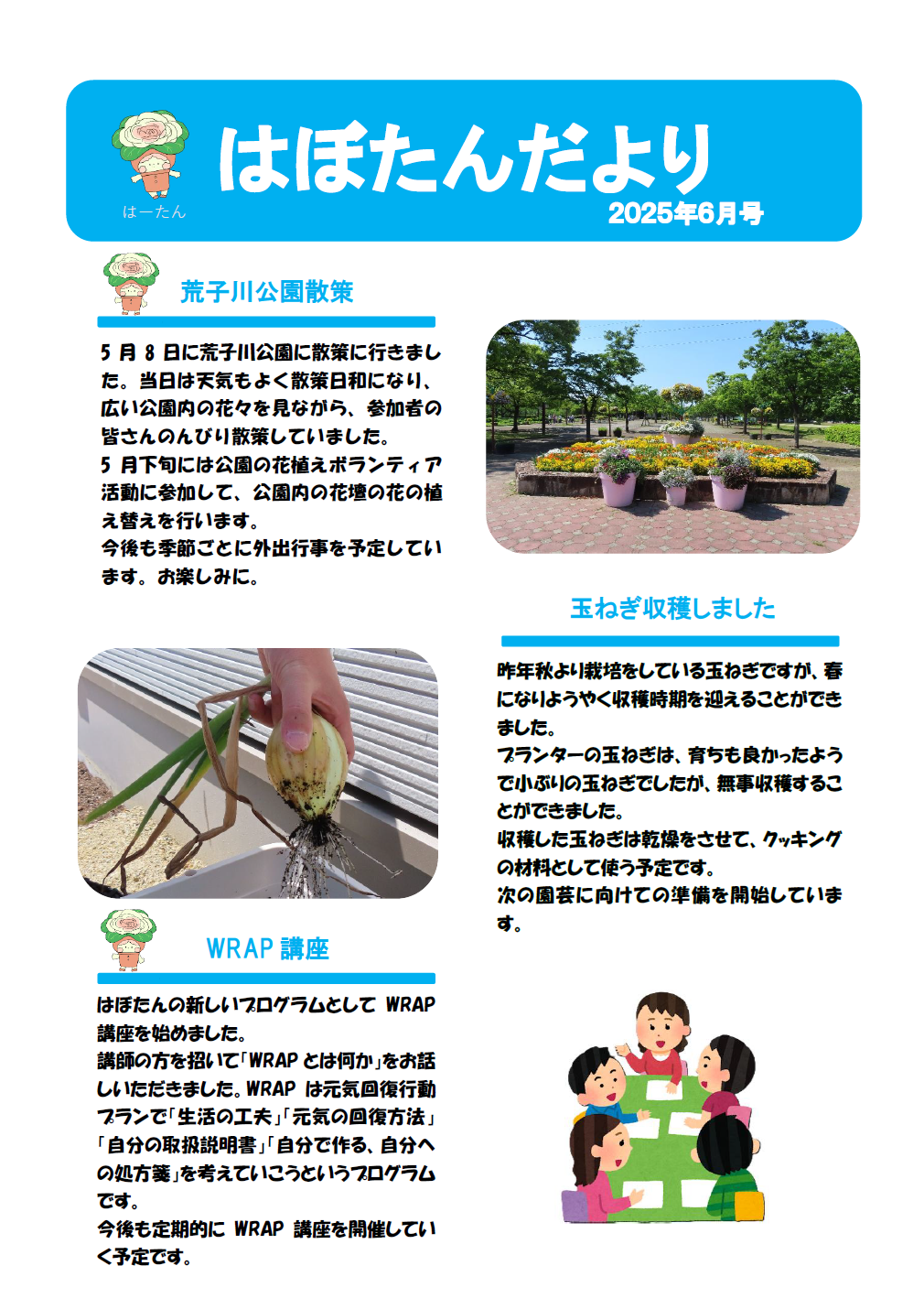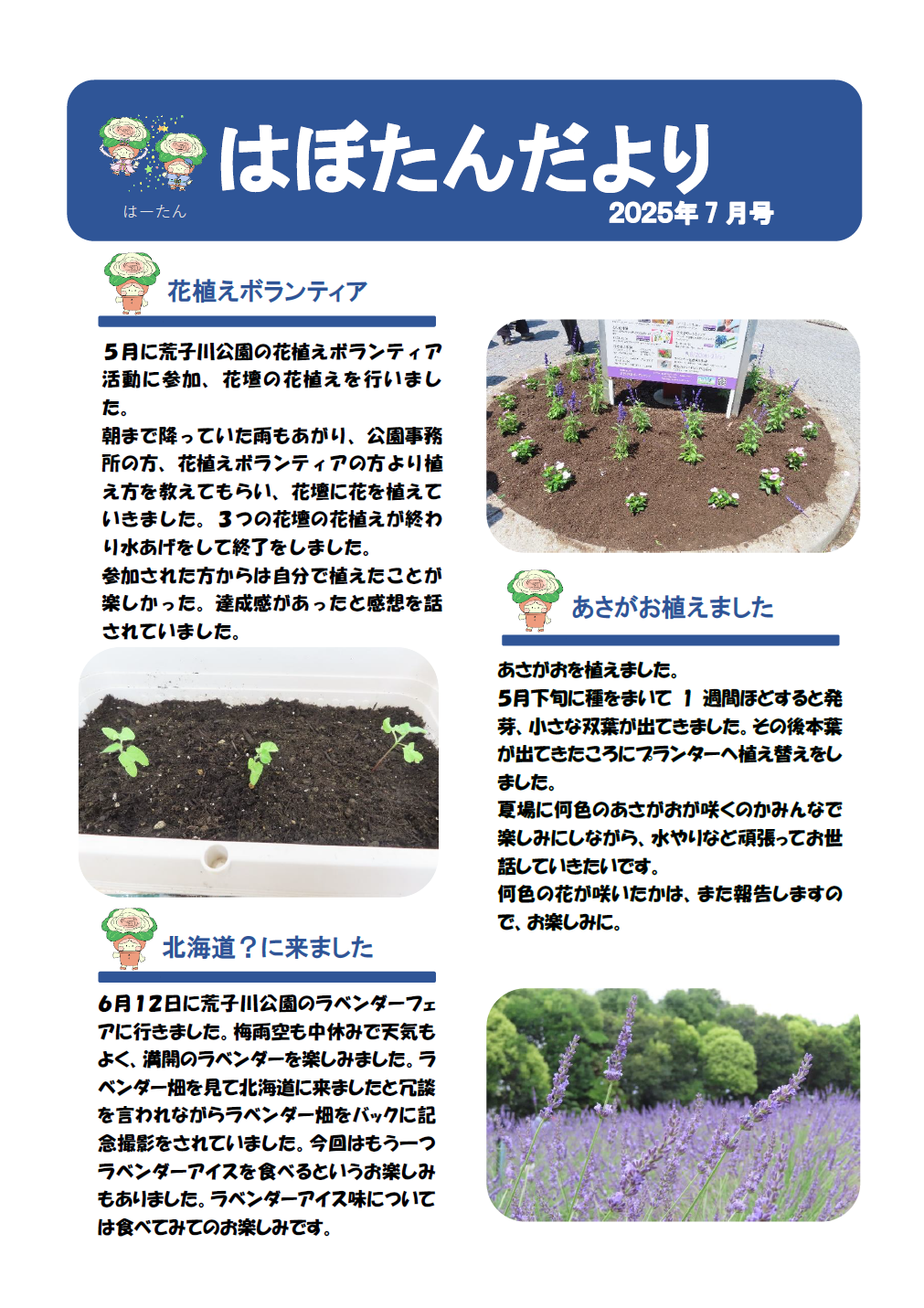 はぼたんだより 2025年度7月号 公開日:2025年6月30日 地域活動支援センター「はぼたん」 花植えボランティア 5月に荒子川公園の花植えボランティア活動に参加、花壇の花植えを行いました。朝まで降っていた雨もあがり、公園事務所の方、花植えボランティアの方より植え方を教えてもらい、花壇に花を植えていきました。3つの […] 続きを読む