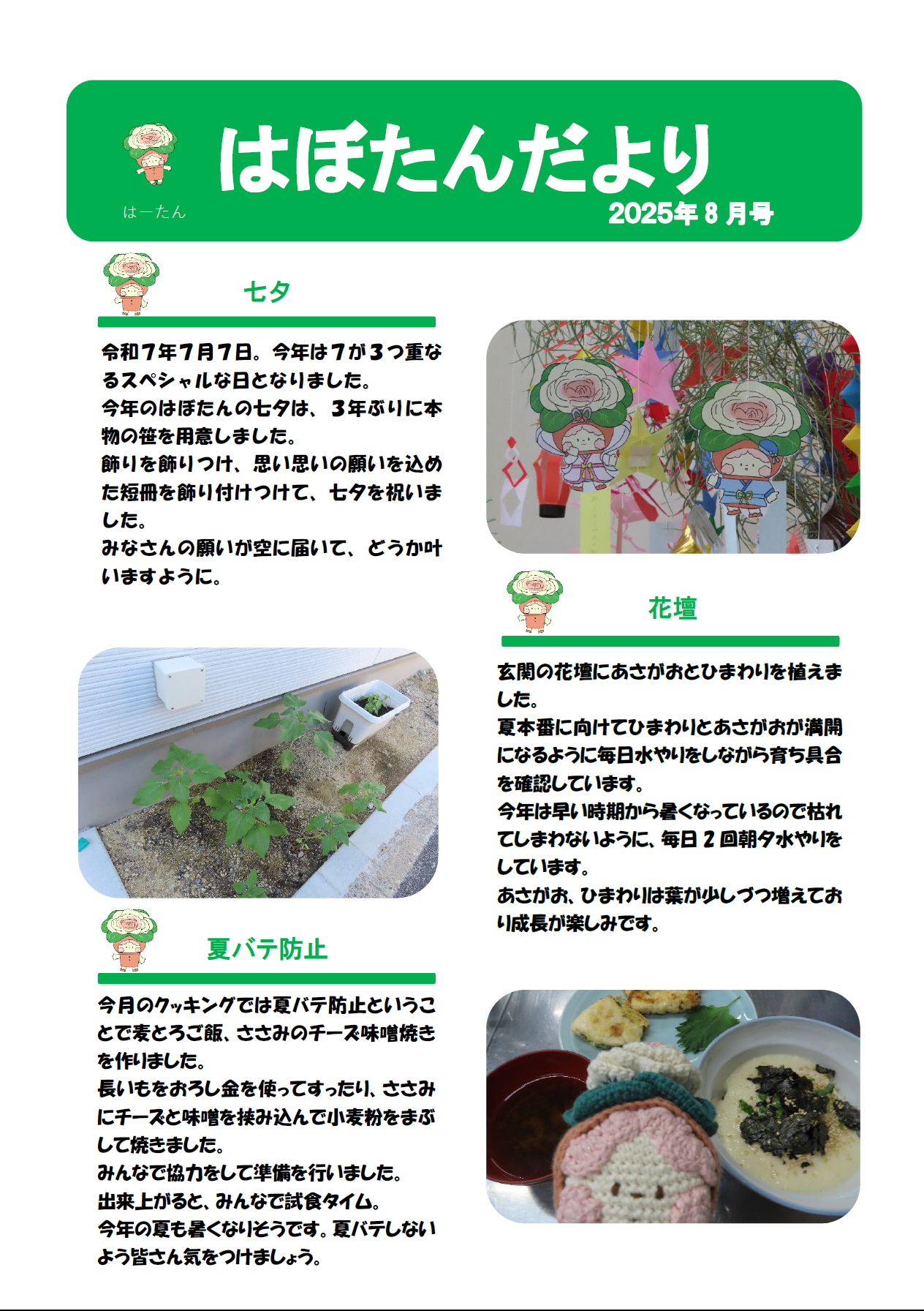 はぼたんだより 2025年度8月号 公開日:2025年7月30日 地域活動支援センター「はぼたん」 七夕 令和7年7月7日。今年は7が3つ重なるスペシャルな日となりました。今年のはぼたんの七夕は、3年ぶりに本物の笹を用意しました。飾りを飾りつけ、思い思いの願いを込めた短冊を飾り付けつけて、七夕を祝いました。みなさんの願 […] 続きを読む