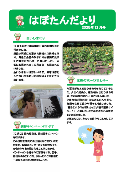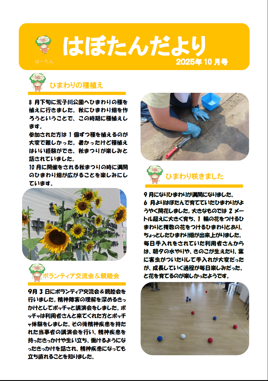 はぼたんだより 2025年度10月号 公開日:2025年9月30日 地域活動支援センター「はぼたん」 ひまわりの種植え 8月下旬に荒子川公園へひまわりの種を植えに行きました。秋にひまわり畑を作ろうということで、この時期に種植えします。参加された方は1個ずつ種を植えるのが大変で難しかった。暑かったけど種植えはいい経験ができ […] 続きを読む