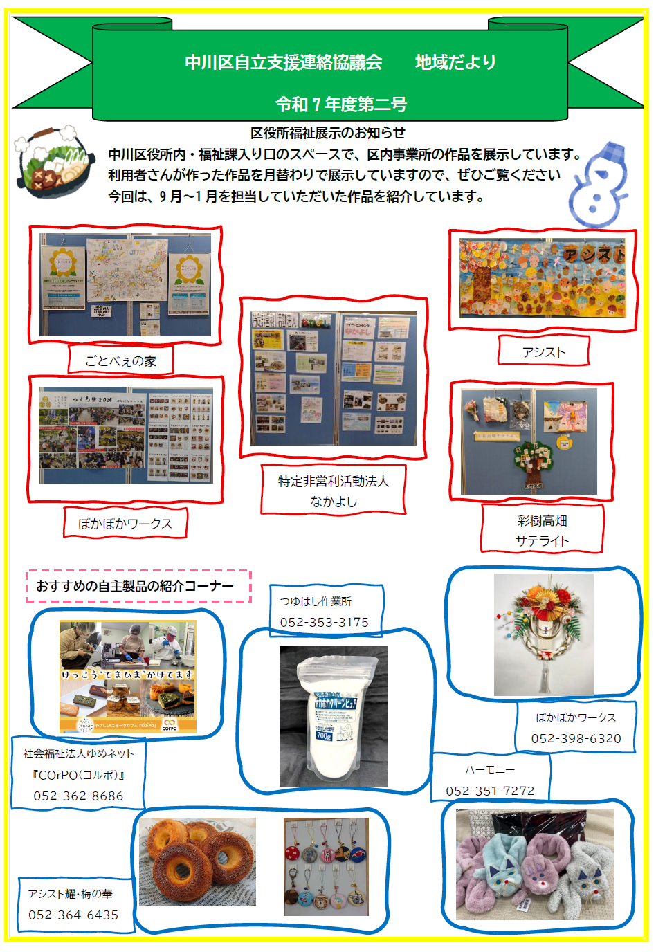 中川区自立支援連絡協議会 地域だより 令和7年度第二号 公開日:2026年2月2日 自立支援協議会 区役所福祉展示のお知らせ中川区役所内・福祉課入り口のスペースで、区内事業所の作品を展示しています。利用者さんが作った作品を月替わりで展示していますので、ぜひご覧ください今回は、9月~1月を担当していただいた作品を紹介し […] 続きを読む